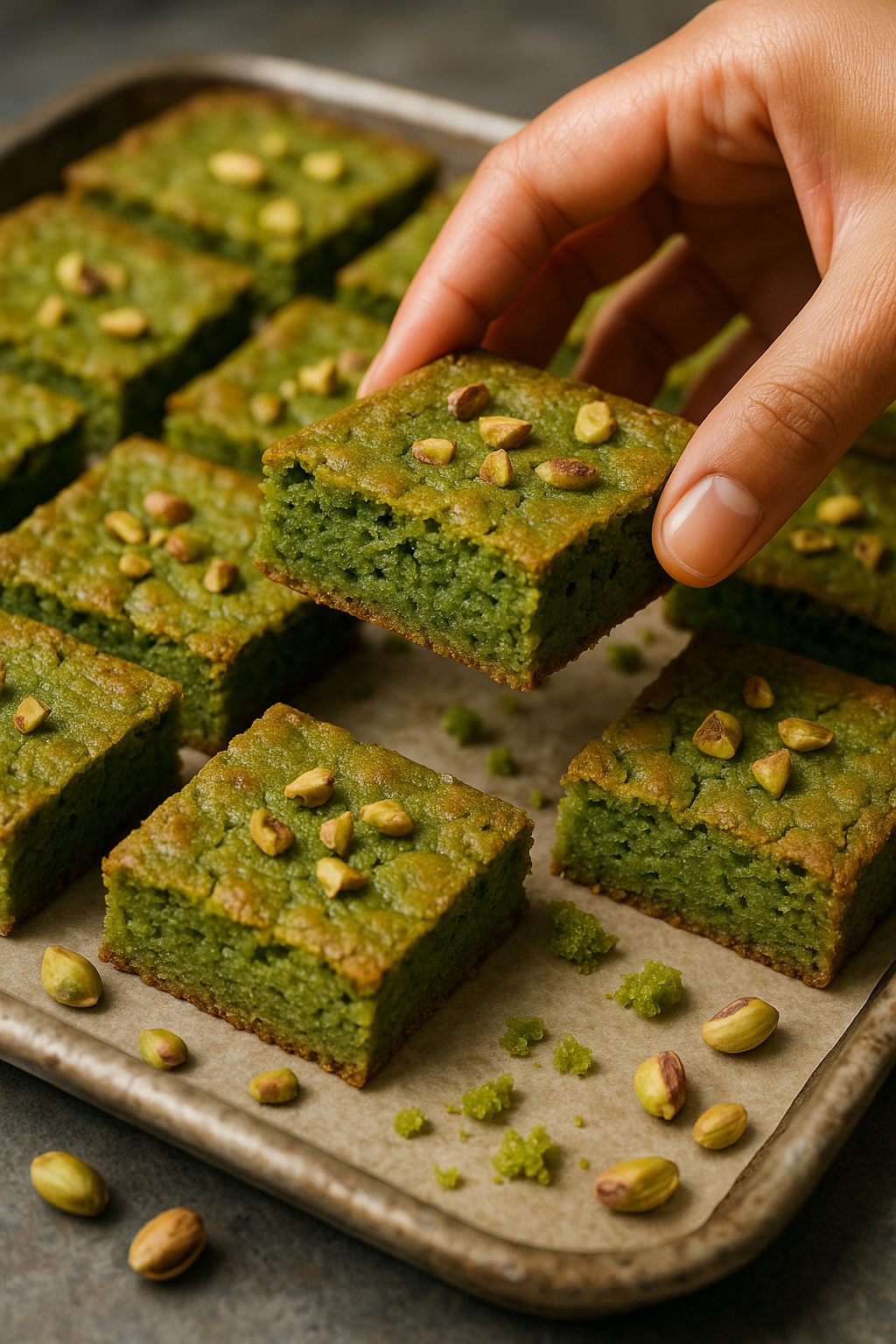 O brownie de pistache é uma versão sofisticada do clássico, com sabor intenso de chocolate e aquele toque crocante e amanteigado do pistache. A massa é simples: leva ovos, açúcar, manteiga, cacau e chocolate derretido, ganhando textura densa e úmida depois de assada. O pistache entra pra dar o contraste perfeito e deixar o visual ainda mais elegante.